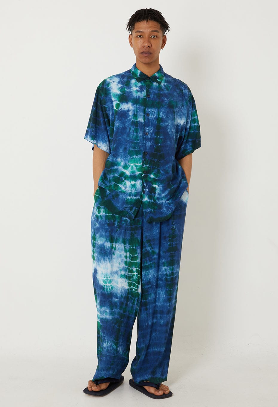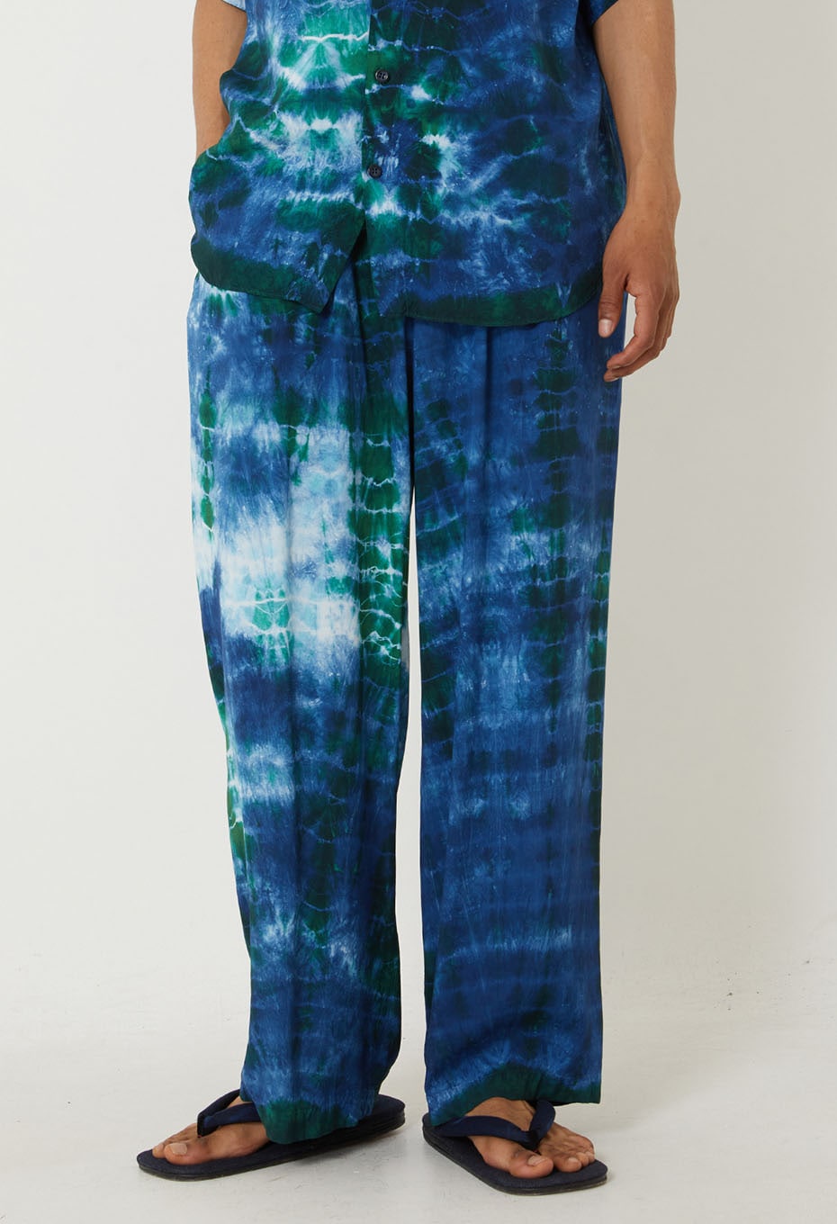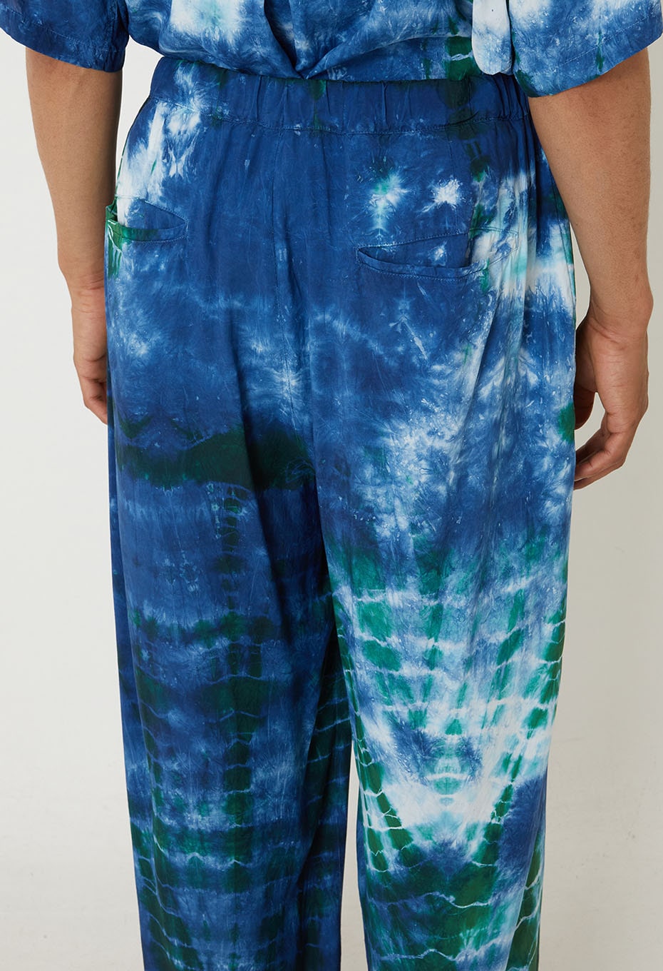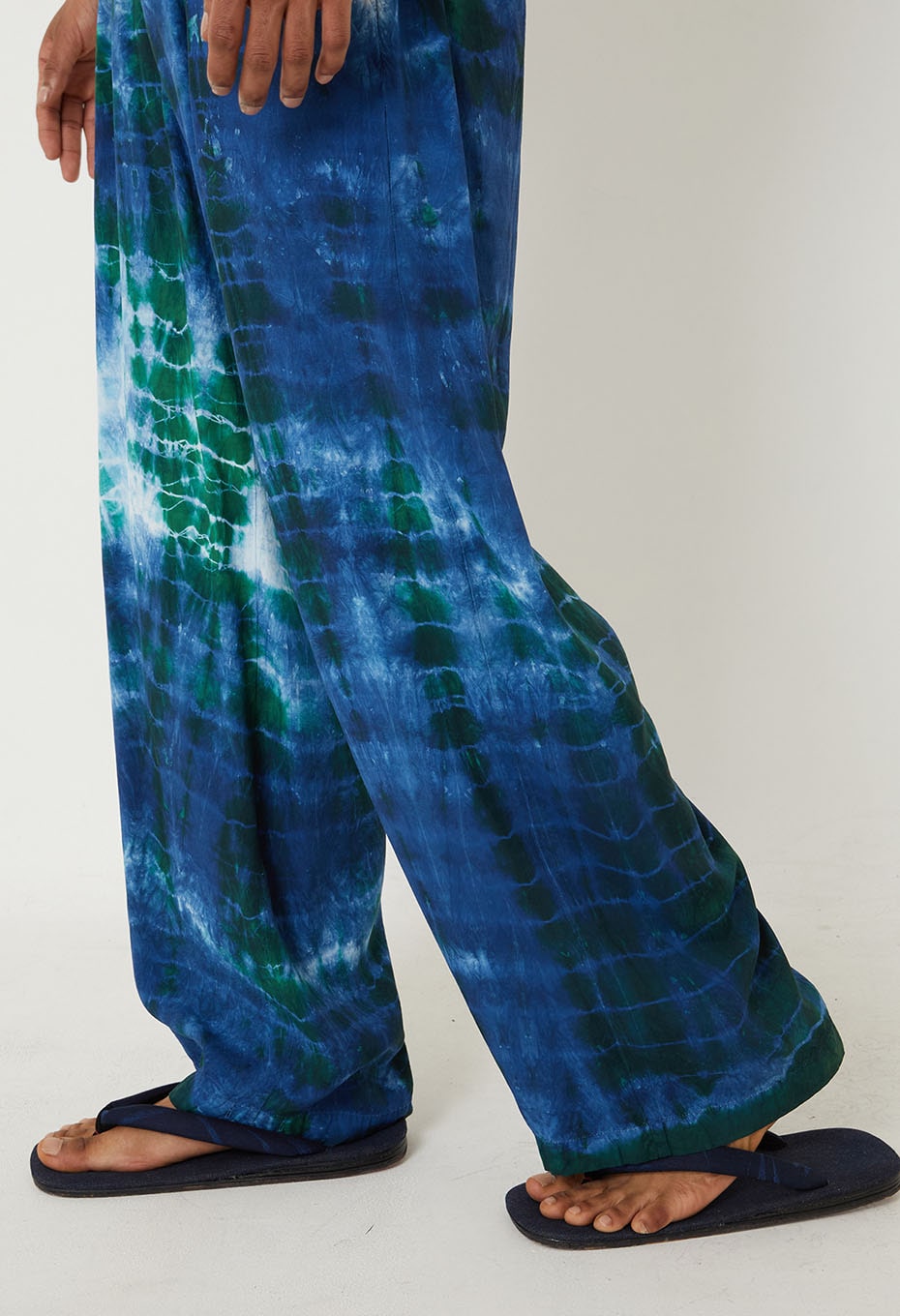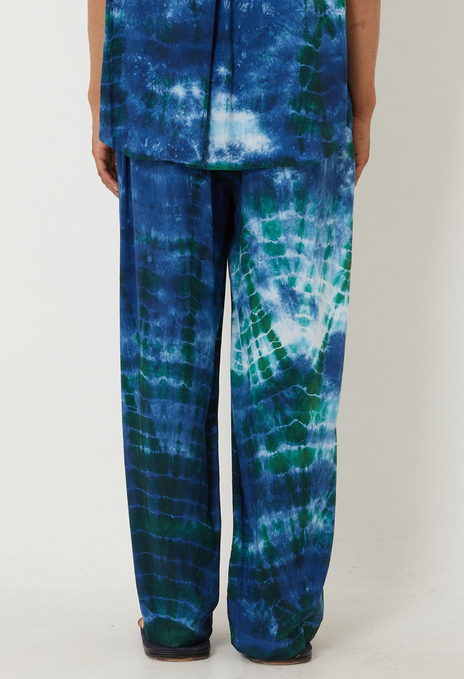 Chaque pièce est teinte individuellement à la main selon la technique shibori, en deux bains successifs mêlant bleu-vert et indigo, donnant naissance à un mélange de couleurs profond et nuancé, unique à chaque pantalon.