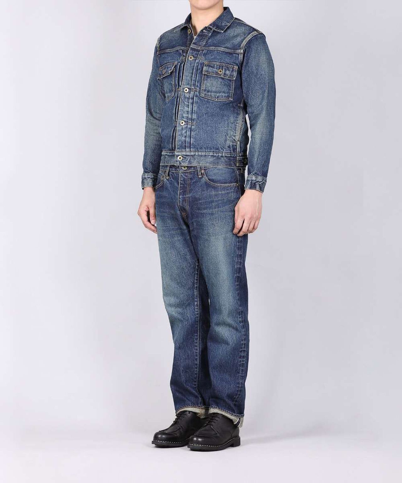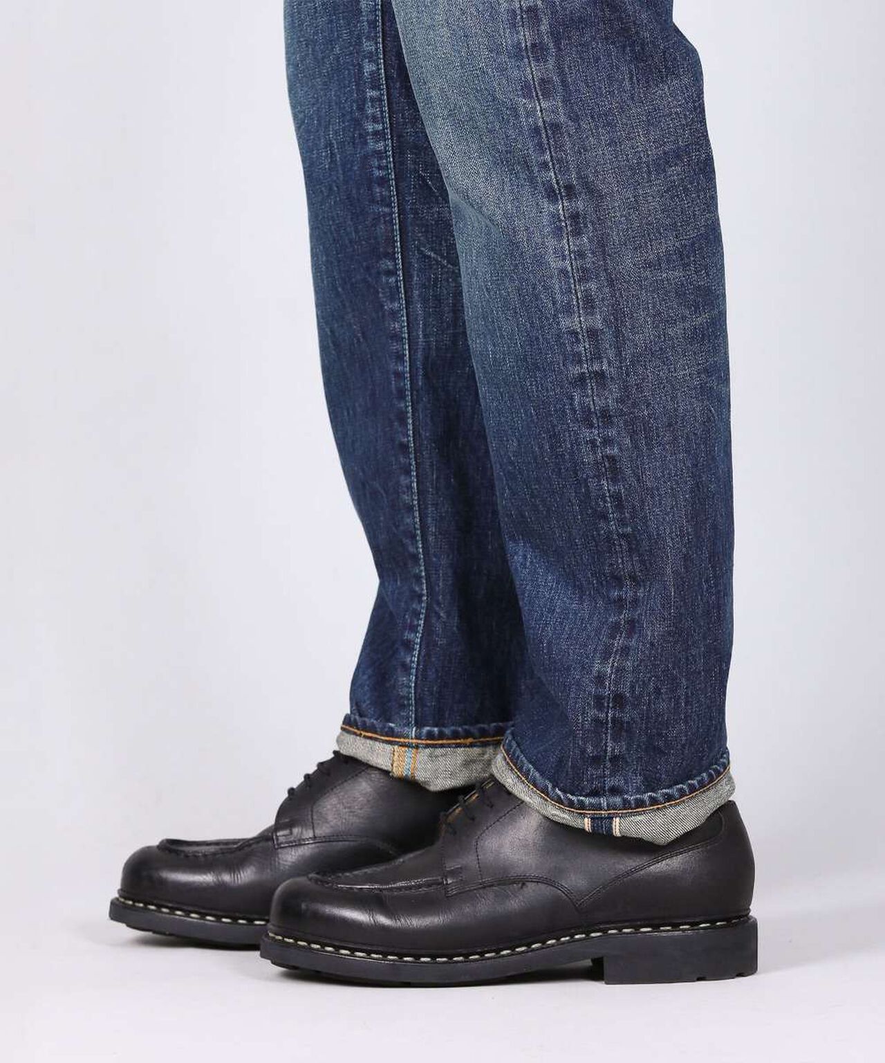 Cette coupe Classic Straight présente une taille mi-haute et une jambe droite légèrement fuselée, offrant une silhouette ample et confortable, sans effet "baggy". Confectionné en denim selvedge 14.8oz issu de Japan Blue Jeans, ce tissu japonais d’Okayama se distingue par son fil fortement torsadé garantissant une résistance accrue et un relief marqué. Sa texture sèche au style vintage assure une rigidité pérenne. Le traitement Aging Wash confère un délavage travaillé avec des contrastes prononcés, des moustaches et une patine authentique. Ce denim 100 % coton, sans élasticité, développe sa profondeur de teinte et s’embellit avec le temps tout en conservant sa solidité.