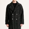 Ce manteau oversize présente une maille bicolore effet chiné (sel & poivre) et une doublure en sergé de viscose. Il est doté d'un grand col à revers classique avec un bouton de maintien, ainsi que d'une ouverture croisée à double boutonnage avec des boutons en corne découpés au laser. Ses poches verticales à passepoil et ses finitions à bords francs soulignent son élégance. Confectionné en Italie, il combine 24 % laine vierge, 22 % acrylique, 16 % alpaga, 16 % laine, 11 % polyamide, 6 % lin et 5 % coton.
