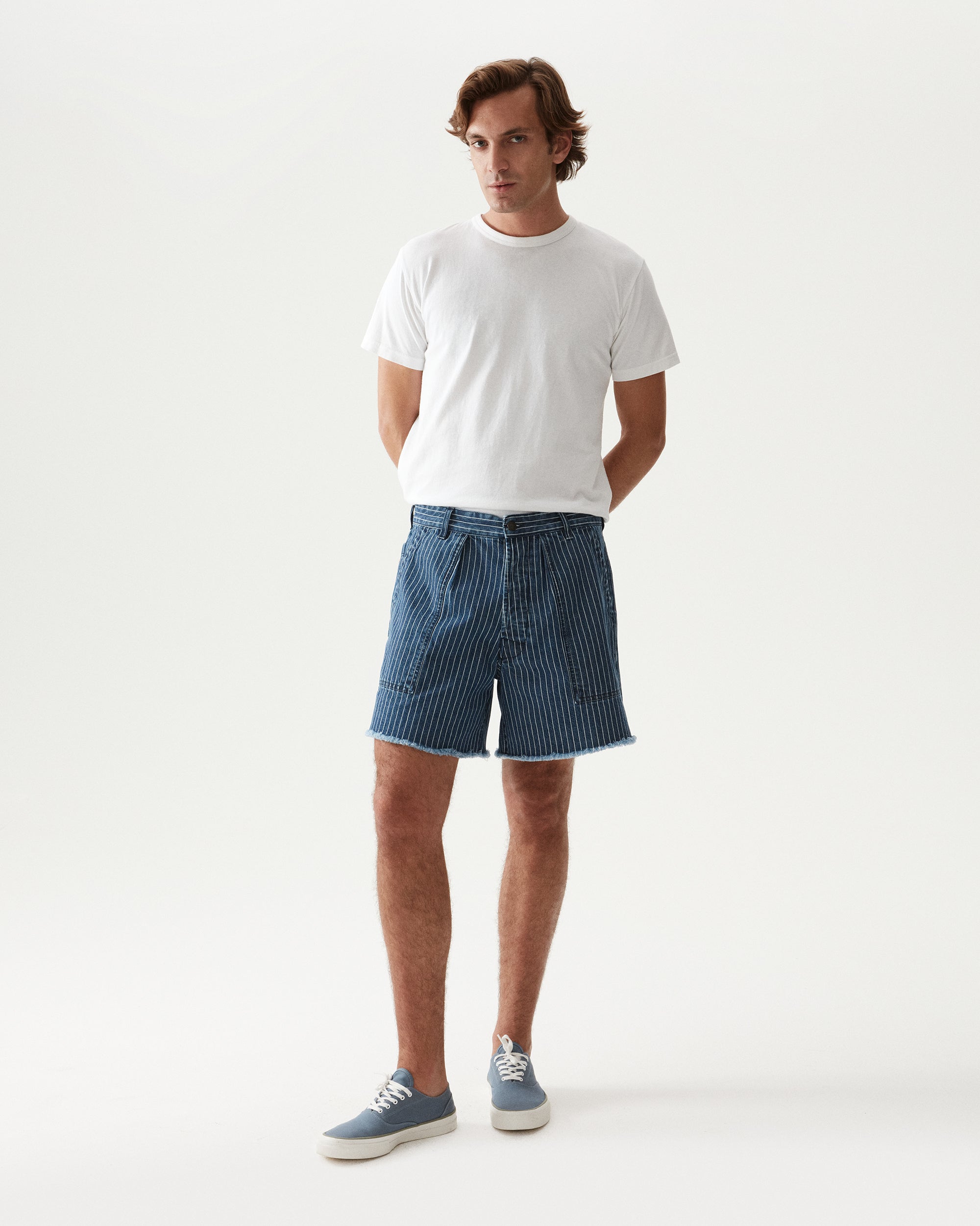 Les Colonel Pinstripe Denim Shorts incarnent l’approche artisanale et intemporelle de FORTELA. Confectionnés en Italie dans un denim 100% coton à rayures tennis (pinstripe), ils offrent une interprétation raffinée du short casual. Leur design mêle héritage sartorial et confort moderne, pour une pièce estivale élégante et durable.