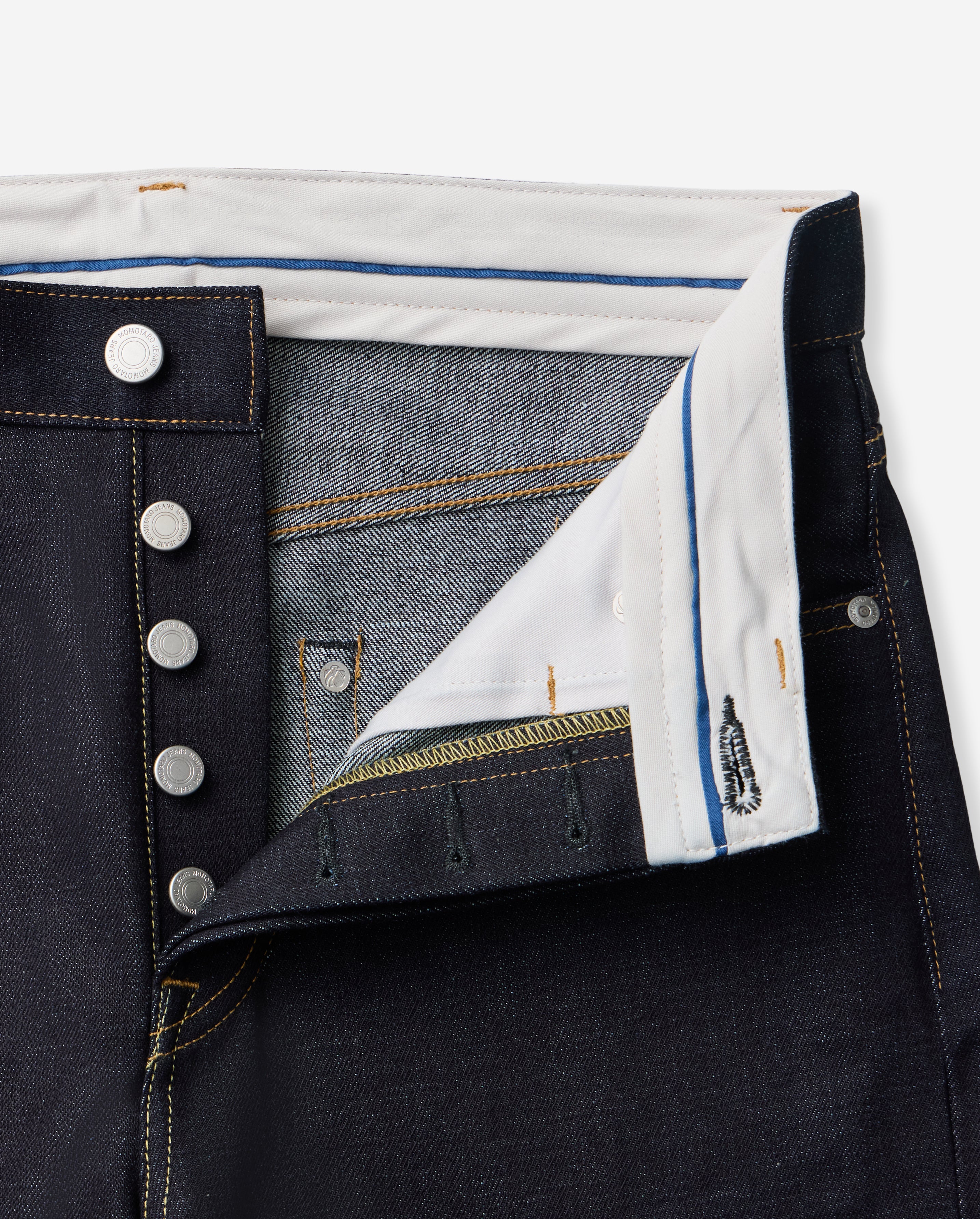 - Matière : Denim TOKUNO BLUE rigide (non lavé), reconnu pour sa teinte indigo profonde et sa texture distinctive.