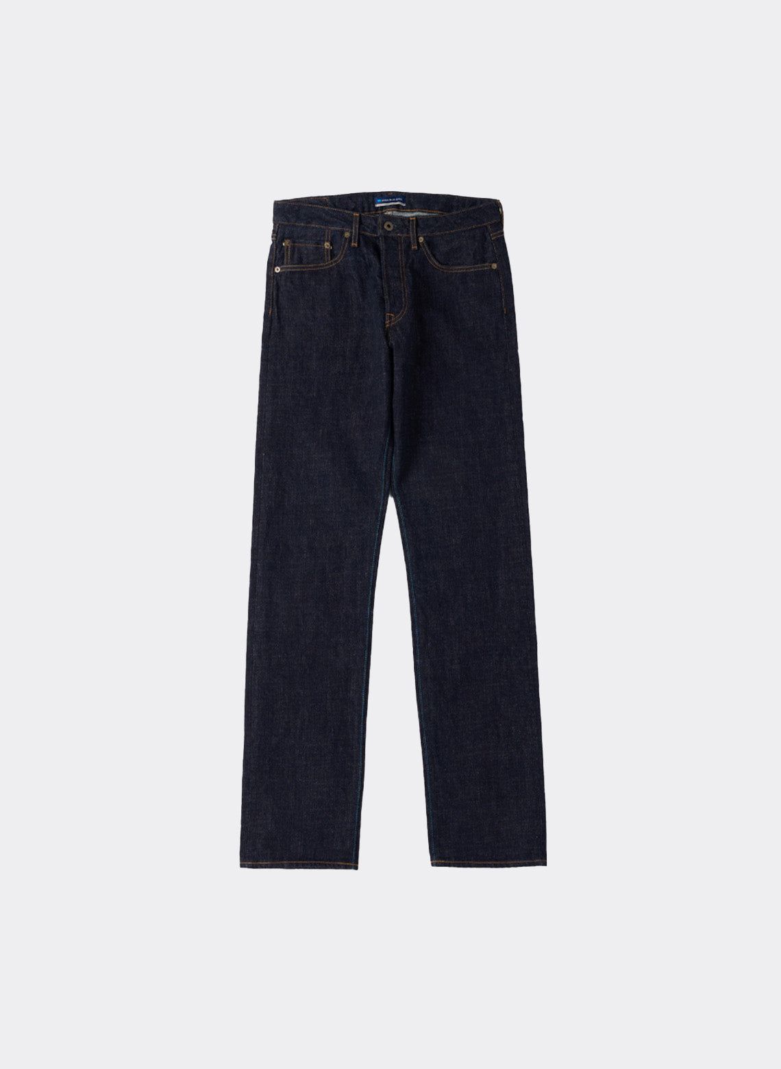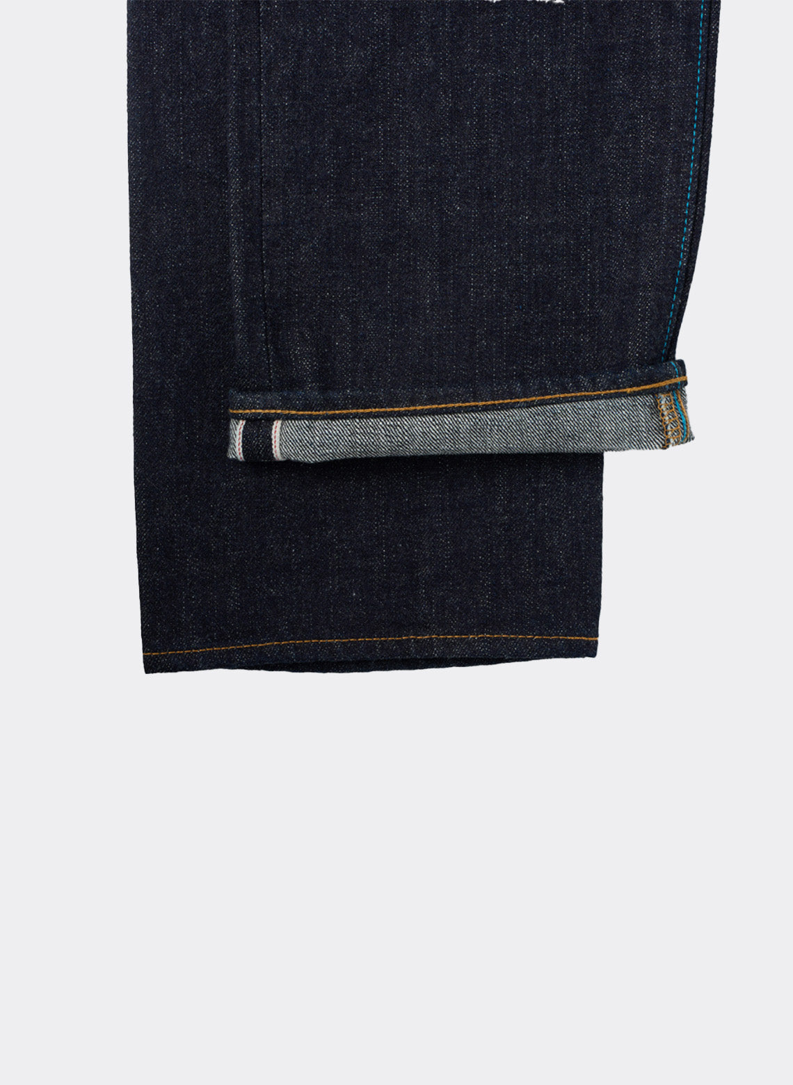 Son coupe droite (straight fit) offre une silhouette équilibrée et confortable, adaptée à un usage quotidien. Le traitement one wash permet de stabiliser la toile tout en conservant le caractère brut et profond de l’indigo.