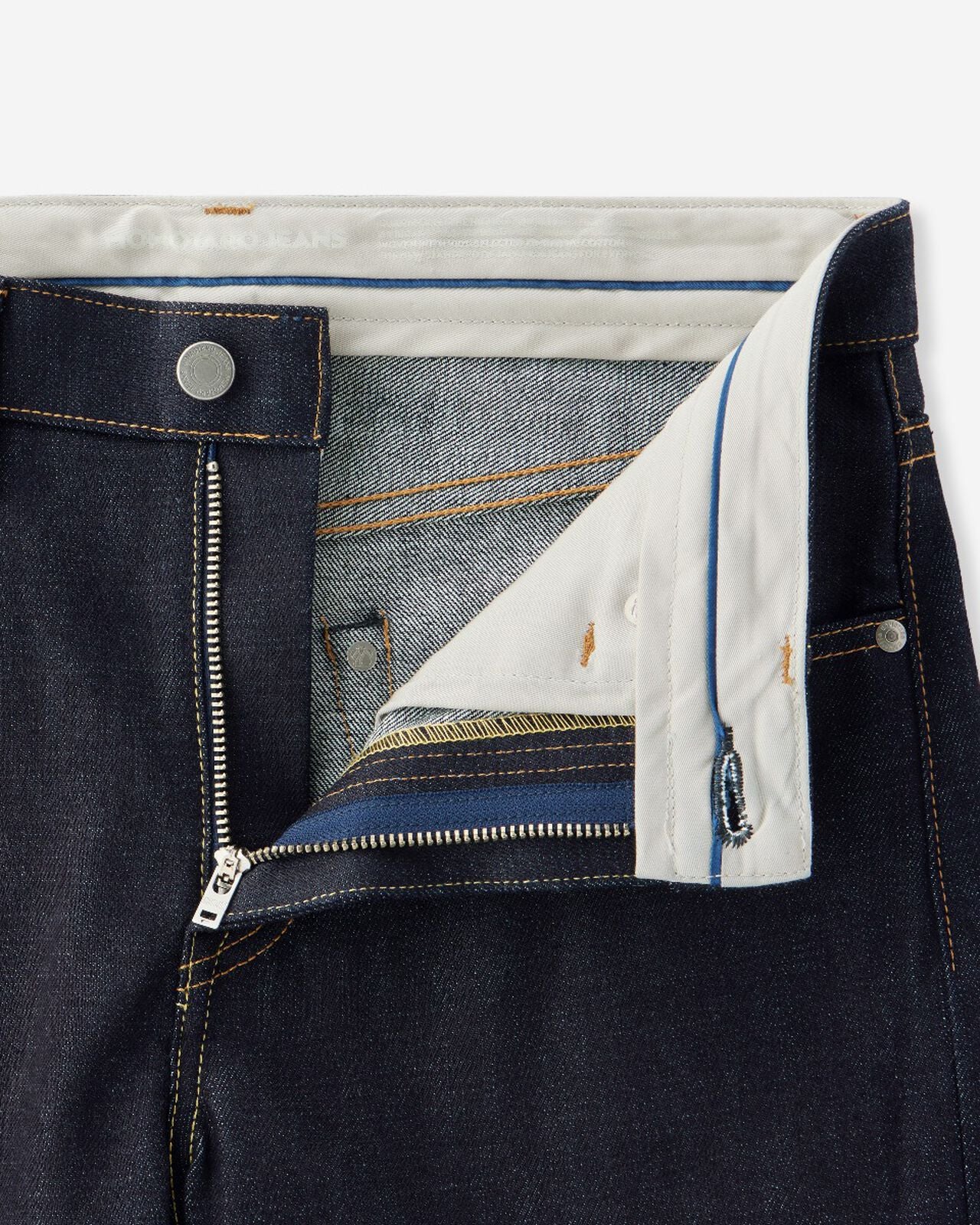 Afin d’intensifier la couleur indigo des fils de chaîne, la composition du denim sergé a été repensée, avec l’utilisation de fils de trame plus fins. Un procédé spécifique a également été appliqué pour réduire au maximum le retrait après lavage, limitant ainsi les inconvénients habituellement associés aux denims rigides et facilitant le choix de la taille.