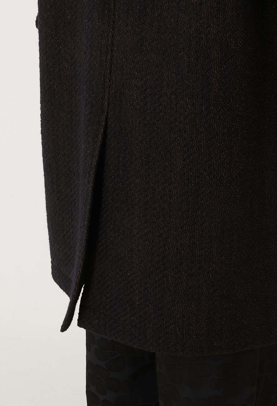 Le tissage dobby confère au tissu une texture profonde, ponctuée de reflets dorés subtilement dispersés sur une base bleu marine intense, renforçant la richesse visuelle du manteau.