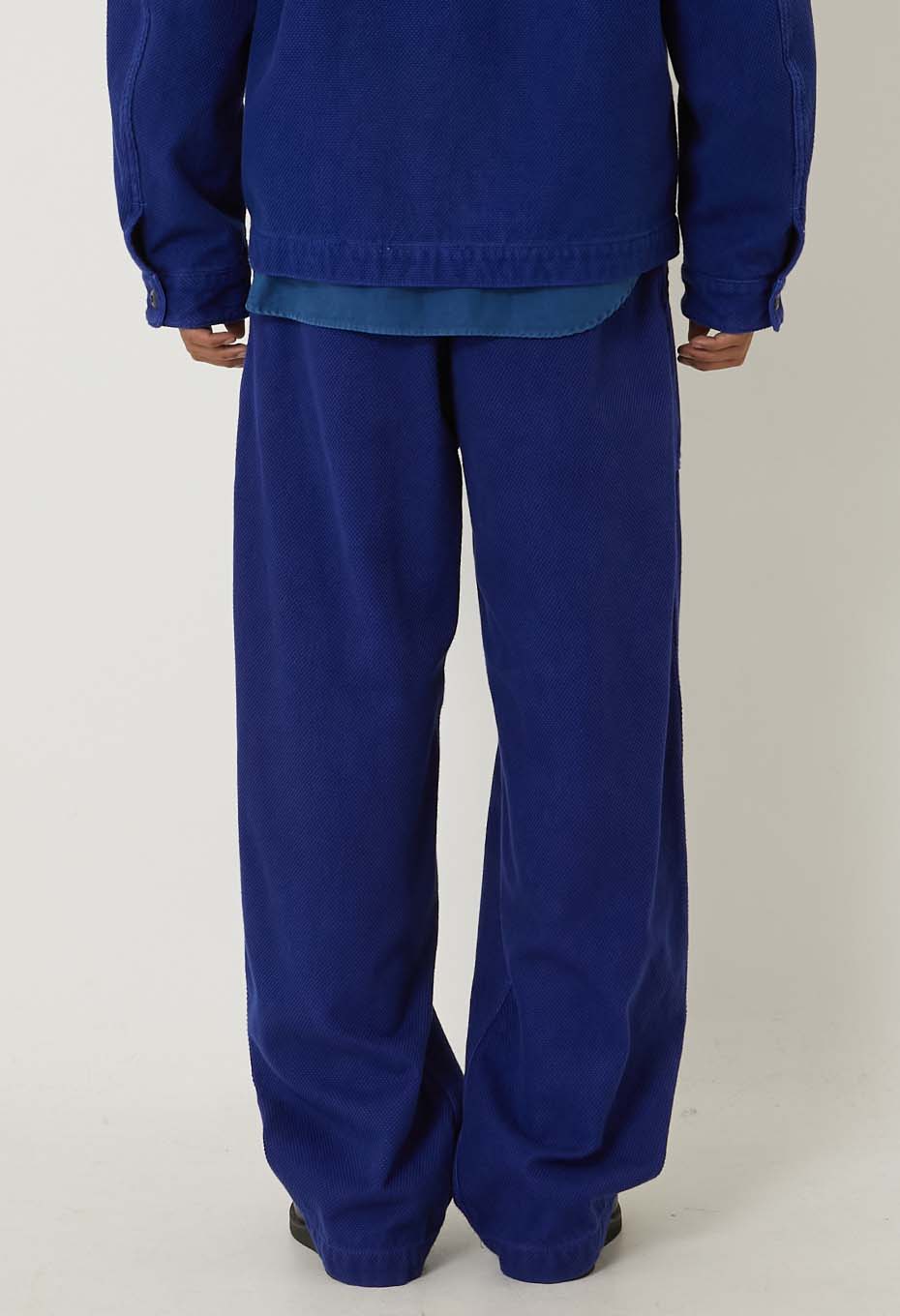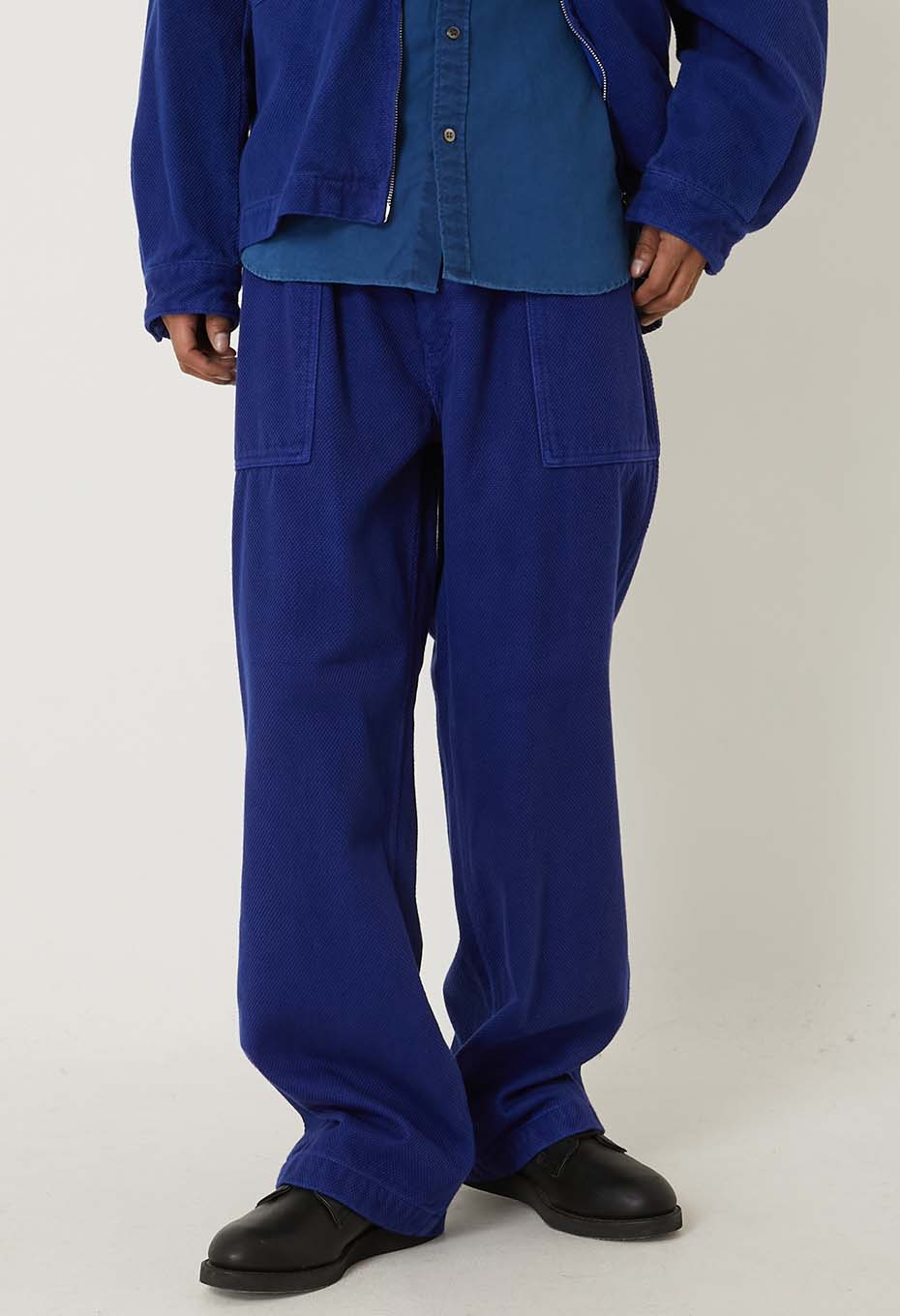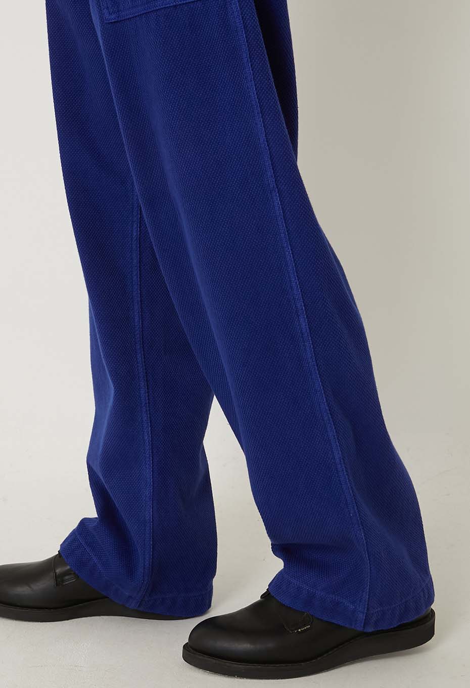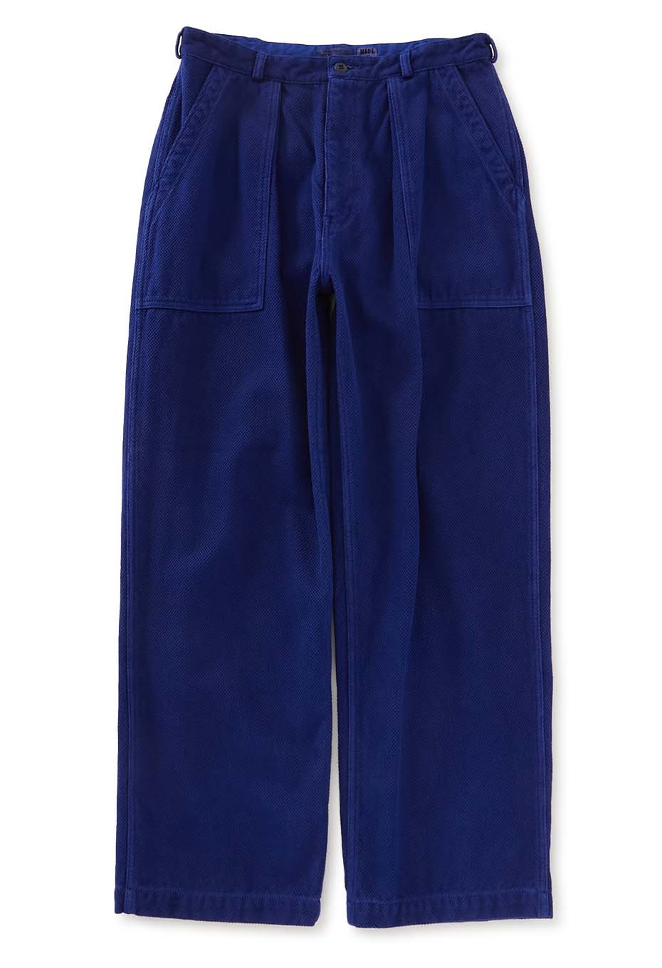 Le pantalon est confectionné en sashiko, un textile japonais traditionnel développé à l’origine pour les uniformes de karaté. Il s’agit de l’un des matériaux les plus emblématiques parmi les collections sashiko de BLUE BLUE JAPAN.